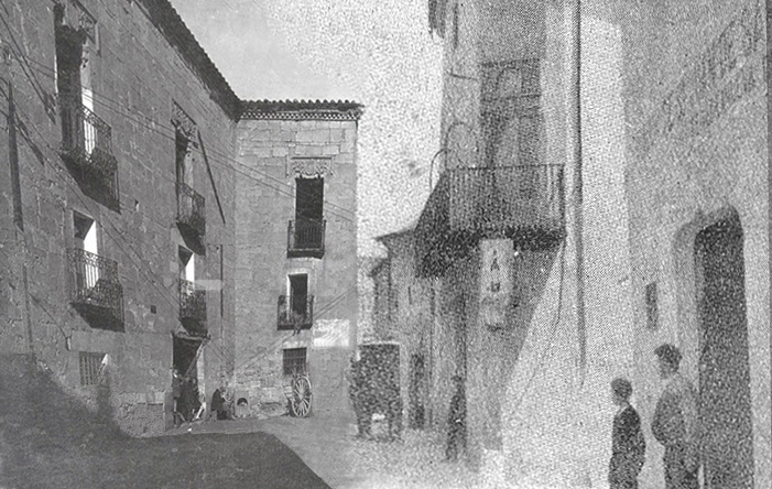 Esta imagen, a pesar de ser una burda simulación mediante la unión de dos fotografías, una de Ansede y la otra de Buxaderas, puede dar a entender la estrechez de la calle del Pozo Amarillo sobre todo en la zona de la que fuera torre de la casa de la Cadena que apenas permitía el paso de un carro. |