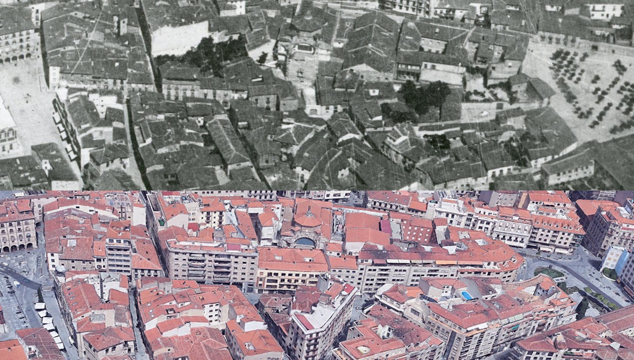 | Comparativa entre la imagen de la calle del Pozo Amarillo captada por un aerostato militar de los ingenieros de Guadalajara en julio de 1915 y una captura actual de una vista aproximada en Google Earth Pro. |