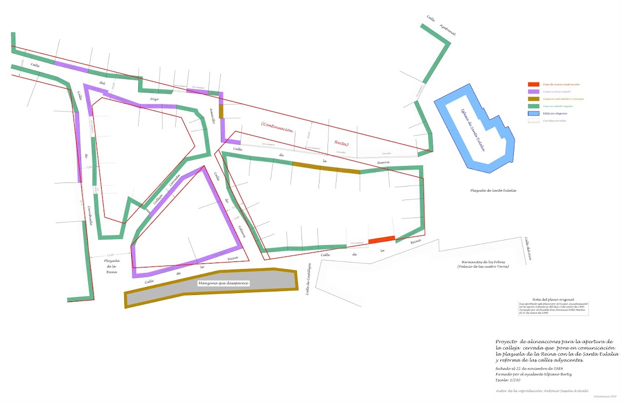 El primer proyecto de ensanche, unión y alineación de estas calles fue presentado en noviembre de 1889 por el entonces arquitecto municipal D. José Gallego Díaz bajo el epígrafe Proyecto de alineación para la apertura de la calleja cerrada que pone en comunicación la Plazuela de la Reyna con la de Santa Eulalia y la reforma de las calles adyacentes, proyecto que fue derogado en 1902 y sustituido por otro con la misma finalidad en 19109.