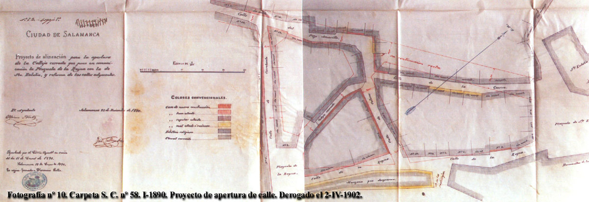 | Plano del proyecto de alineación y unión de la calle del Pozo Amarillo y de la calle de la Guerra del arquitecto José Gallego Díaz en 1890, del libro de David Senabre López Desarrollo urbanístico de Salamanca en el siglo XX. |