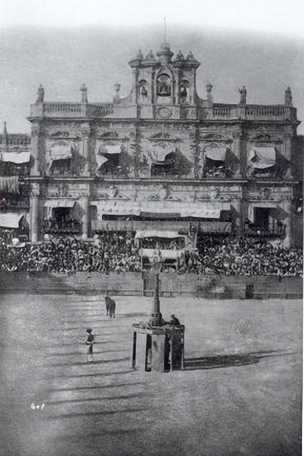 La primera es la falta total de mobiliario urbano o vegetación en el suelo de la Plaza, tal como había estado desde su finalización. El suelo aparece empedrado. No fue hasta 1863 cuando se instaló una pequeña fuente de recipiente octogonal muy estrecho que disponía de una farola decorada con cabezas de niños. (La misma que todos hemos visto en la fotografía atribuida al fotógrafo transeúnte Belvedere durante una corrida de toros)