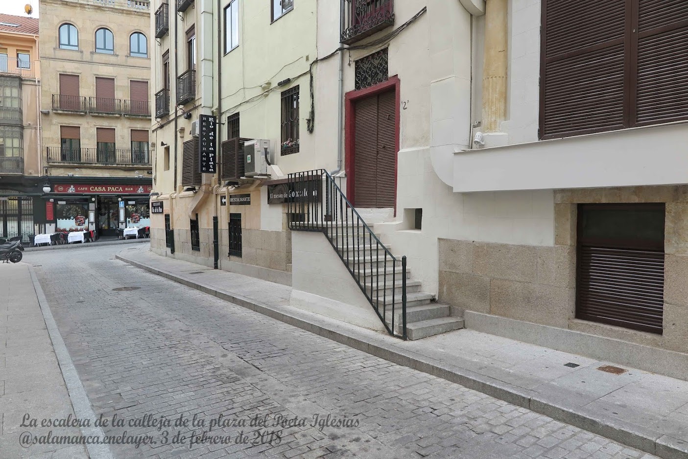 La modificación de los niveles del suelo en la plaza del Poeta Iglesias afectó especialmente al edificio número 5 que quedó alterado en sus alturas. En la zona más baja, hacia el hotel, el sótano afloró, aún más del metro que ya lo estaba en tiempos de la bodega de la Alhóndiga, por encima del nivel del suelo (El Mesón de Gonzalo) y quedó elevada su planta baja (hoy también Mesón de Gonzalo y hasta hace poco El Surtidor) que precisó de la ampliación de las escaleras de obra para su acceso, con el consiguiente estorbo en las aceras. En la zona más alta fue necesaria la colocación de escaleras de madera provisionales (imagen) hasta que los propietarios modificaron los niveles del suelo de sus locales para enrasarlos con la calle. Tras un largo acuerdo con el Ayuntamiento, estos arreglos fueron costeados por los propietarios, pero con cargo a sus contribuciones municipales.