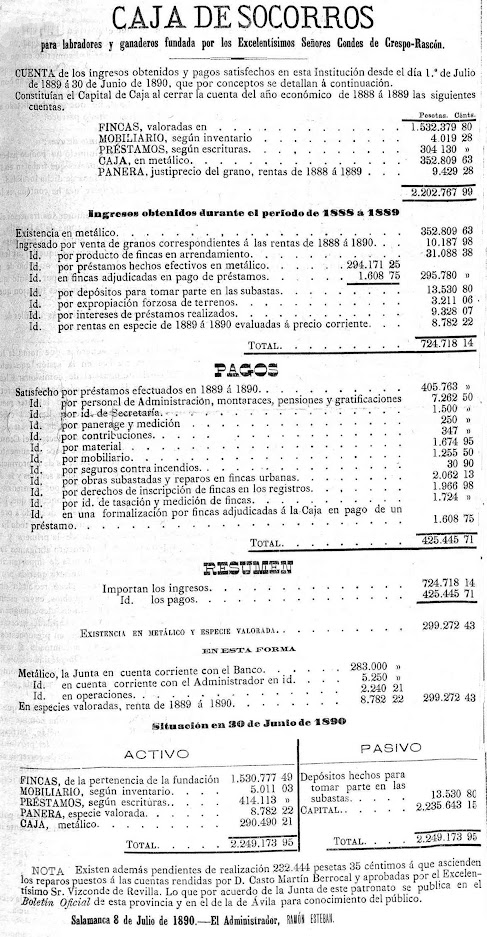 A propósito de la venta de una dehesa nos enteramos de que la Caja de Socorros de Labradores y Ganaderos de los Condes de Crespo Rascón ha pasado a formar parte de la Fundación Rodríguez Fabrés, sin que nos conste la fecha en que tal hecho ha ocurrido. Lo apunta en su tesis doctoral Víctor M. González Sánchez cuando relata que la dehesa de Castillejo de Evans, en el término municipal de Cipérez, de 572 hectáreas, 35 áreas y 57 centiáreas de pasto, monte y labor y haciendas necesarias para la labranza, perteneció a los Condes de Crespo Rascón, quienes a su muerte la legaron a la Caja de Socorros, quien de acuerdo con el testamento procedió a la subasta, adquiriéndola don Tomás García Robles, en calidad de traspaso a favor de don Vicente Rodríguez Fabrés en 1891.