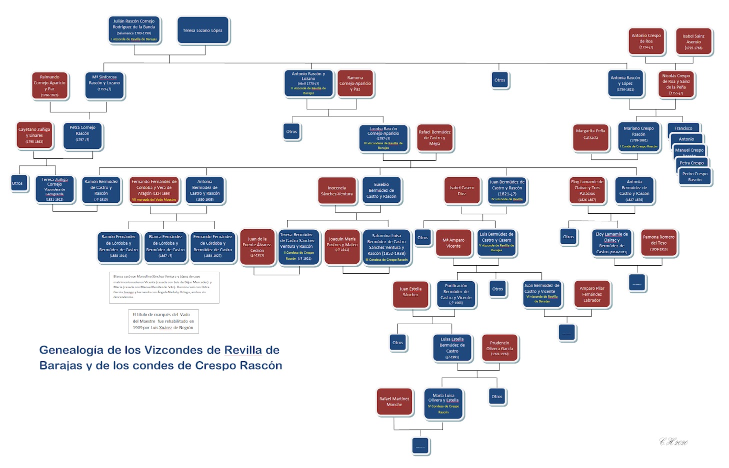 Don Fernando Fernández de Córdoba y Vera de Aragón, 7º marqués de Vado del Maestre, nacido el 1 de enero de 1824 y que falleció el 16 de julio de 1895, se casó con doña Antonia Bermúdez de Castro y Rascón, nacida el 3 de febrero de 1830 y fallecida en Salamanca el 20 de setiembre de 1905, hija de doña Jacoba Ramona Rascón y Cornejo, 3ª Vizcondesa de Revilla de Barajas, prima de don Mariano Crespo Rascón por sus abuelos comunes: Julián Félix Rascón y Barrientos y Teresa López Lozano.