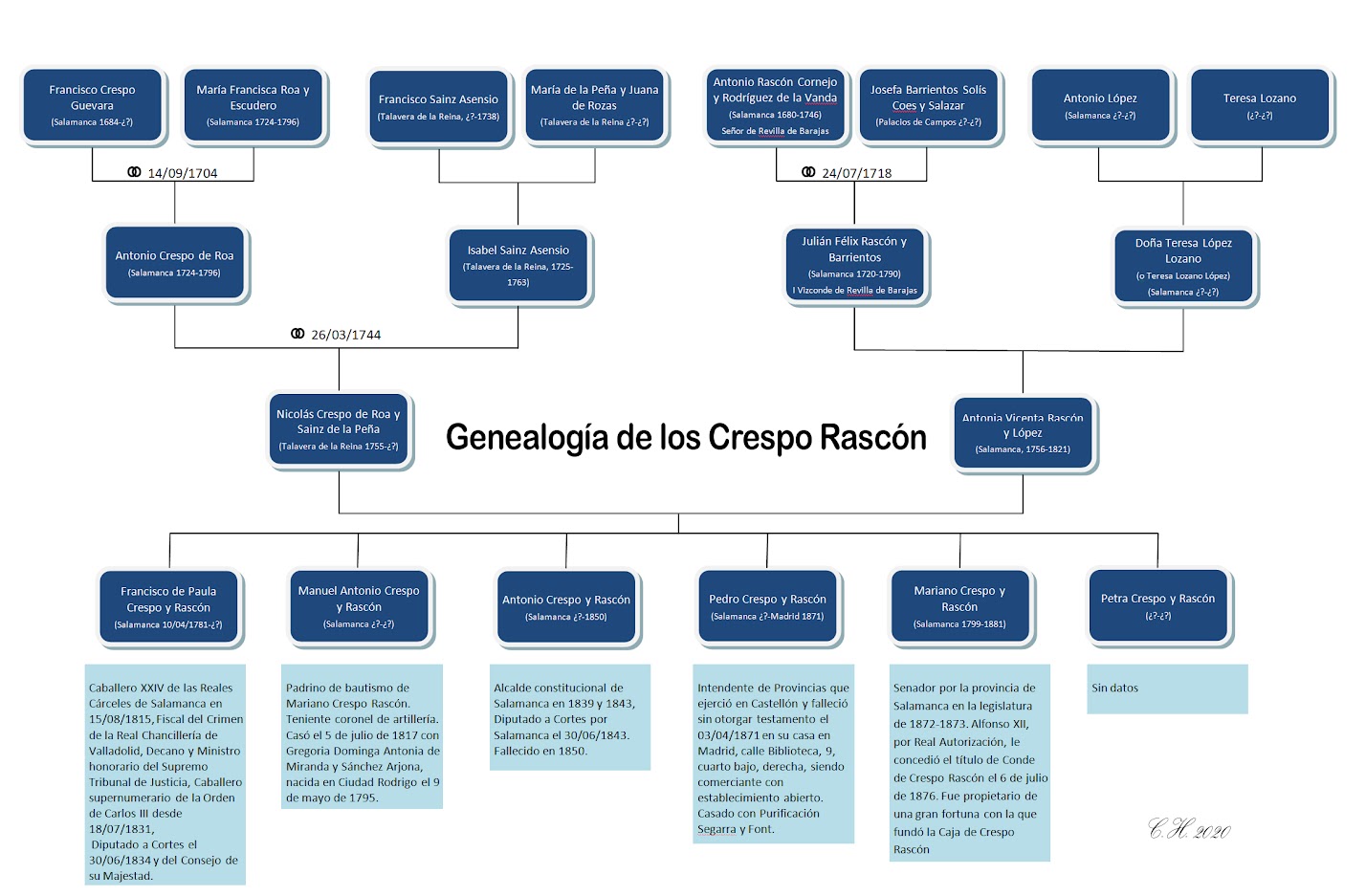 Antonio Crespo de Roa, nacido en Salamanca el 4/9/1724, Caballero XXIV de las Reales Cárceles de Salamanca en 01/3/1769, Jurado 7 por el Estado Noble en 1763 y 1767, Hijodalgo en Talavera de la Reina el 12/06/1752, casado el 26/03/1744 en Talavera con Isabel Sáinz Asensio, nacida en Talavera el 03/12/1725 y fallecida el 22/03/1763. Antonio muere el 25/01/1796.