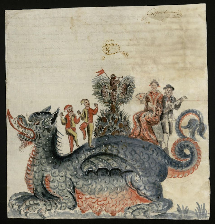 La presencia de figuras fantásticas, ya sean antropomórficas (gigantes, gigantillas y cabezudos) o bestias reales o imaginarias (Tarasca, dragones, sierpes,..), en ritos festivos ancestrales parece ser muy anterior a la festividad del Corpus. La Iglesia, en lugar de prohibirlas, optó por incorporarlas a la procesión de la festividad, con ciertos cambios en su simbología. A la derecha Tarasca para la procesión del Corpus de Madrid de 1744. A la izquierda Tarasca en una tarjeta postal de Tarascon (Francia), la cuna del mito.