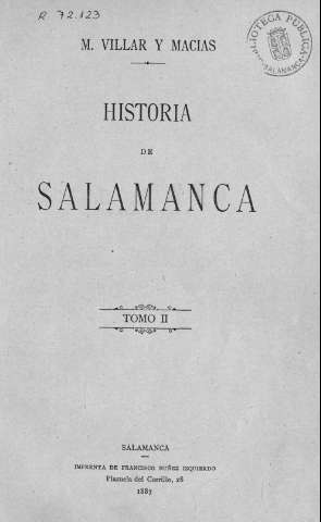 La edición príncipe de la Historia de Salamanca de Villar y Macías en 1887, se hace en los talleres de la plazuela del Corrillo, 28.
