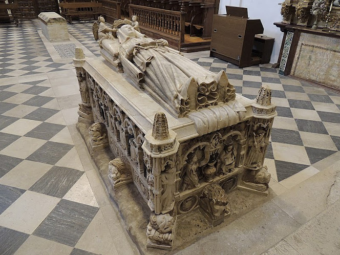 Para el mausoleo del Príncipe se precisaron 25 carretadas de mármol de Carrara que esculpió el maestro Domenico di Alessandro Facelli entre 1511 y 1512 en Génova y luego trasladó al monasterio de Avila. Está decorado en los ángulos con grifos y con medallones de la Virgen y san Juan Bautista, las virtudes teologales, ángeles portadores de blasones, calaveras y trofeos militares enlazados con guirnaldas en los laterales. En la cabecera aparece un medallón con la imagen de santo Domingo y a los pies otro medallón contiene el epitafio del Infante. El sepulcro fue profanado el 8 de agosto de 1809, durante la Guerra de la Independencia, el cadáver extraído del mausoleo, como se pudo comprobar a su apertura en 1961 y se ignora dónde fuera a parar. En Salamanca se honró su memoria en 1998 con una estatua de bronce y pedestal de granito, esculpida por el artista salmantino Agustín Casillas, que se situó en las Peñuelas de san Blas y el 30 de julio de 2013 se colocó en un nuevo emplazamiento en la plazuela de Monterrey. |