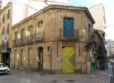 Imagen de Ramón Buxaderas Gombau aparecida en el libro La casa y la vida en la antigua Salamanca de Ángel de Apraiz, 2ª edición 1942. En primer término aparece la puerta del parador de san Juan de Sahagún y tras la bocacalle de Correhuela un edificio en chaflán cuyo lugar ocupó el actual de Pedro Jaén una vez alineada la calle. |