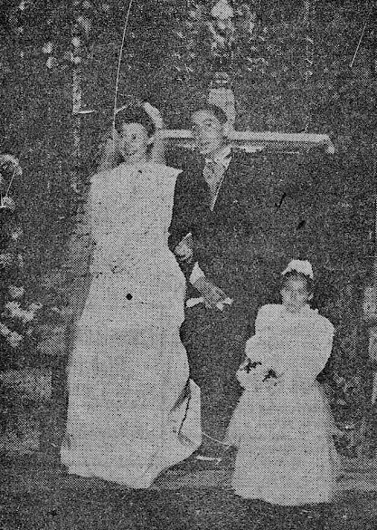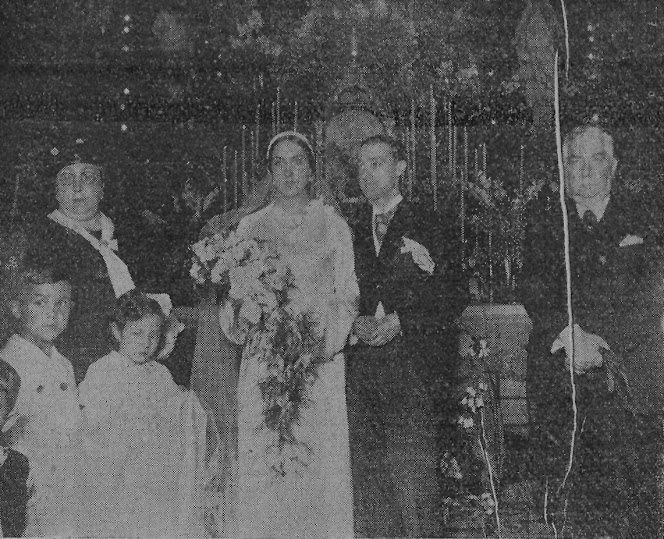 | Boda de Mary Santiago Mirat y José Suárez Fernández en la iglesia de san Martín con sus padrinos doña Aurelia Mirat y don Benito Suárez. Fotografía de Almaraz en El Adelanto |