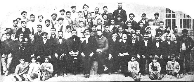 | Juan Casimiro Mirat con sus hijos y empleados. Viuda de Oliván en El Lábaro 1906 |