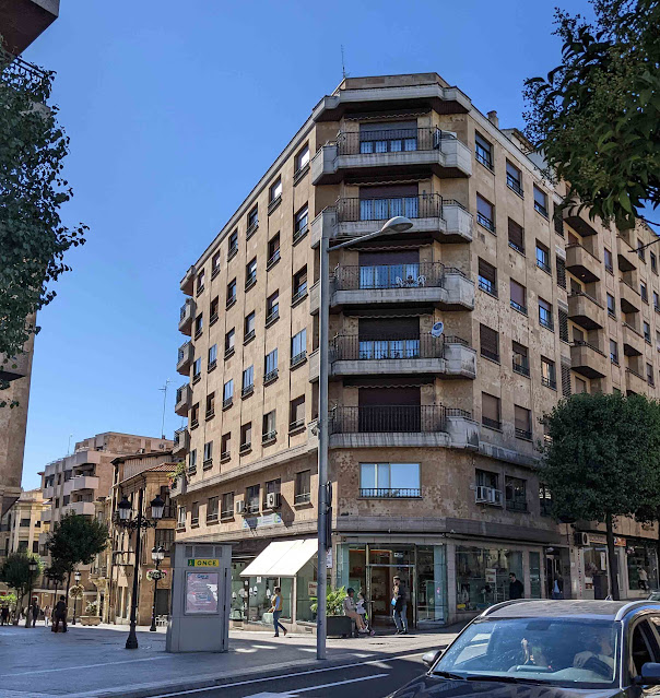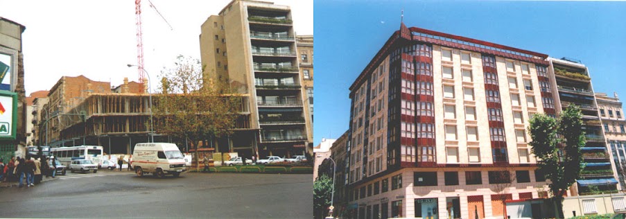 En la imagen, a la izquierda, al final de la calle Toro, se observa un edificio, hoy desaparecido, que fuera representante destacado de la arquitectura polícroma salmantina. Fue proyectado por el arquitecto D. Joaquín de Vargas y promovido por el maestro de obras D. Victoriano García Sánchez. Se construyó, con fachada de ladrillo y piedra franca, en 1905, en el solar que había resultado del derribo de los números 79, 81 y 83 de la entonces calle Doctor Riesco.