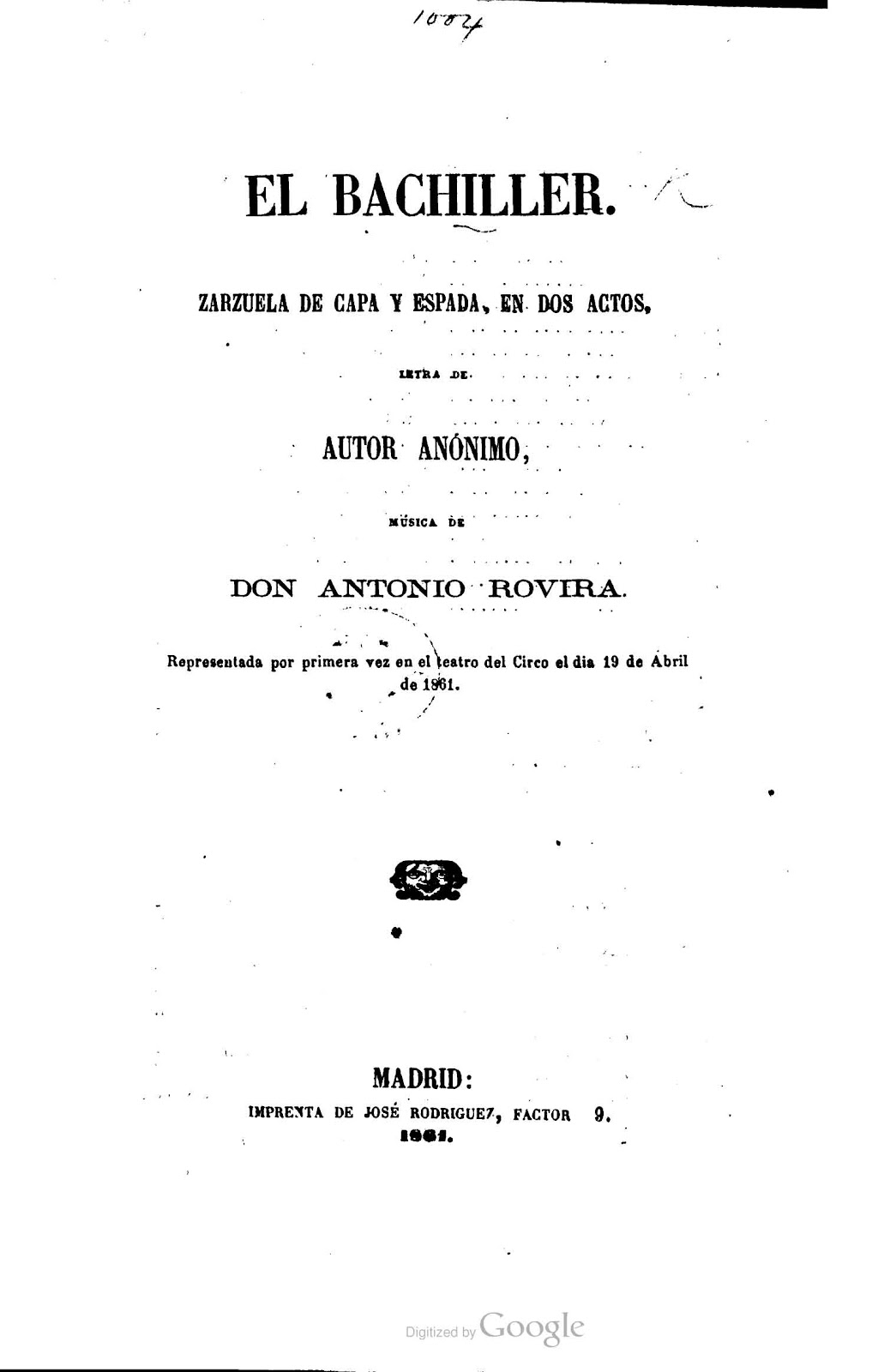 Zarzuela de capa y espada en 2 actos, dialogados y en verso, música de Antonio Rovira. Compuesta en 1860 con letra de autor anónimo, aunque algunos la atribuyen a Antonio Alvera Degrás y autorizada el 28/02/1861. La acción transcurre en Salamanca durante el reinado de Felipe IV y se estrenó en el teatro del Circo de Madrid el 19/04/1861. Rovira tuvo una Academia de canto en la calle de Pozas, 2 cuarto, 2º, de Madrid. Leer Portada del libreto de la zarzuela El Bachiller |