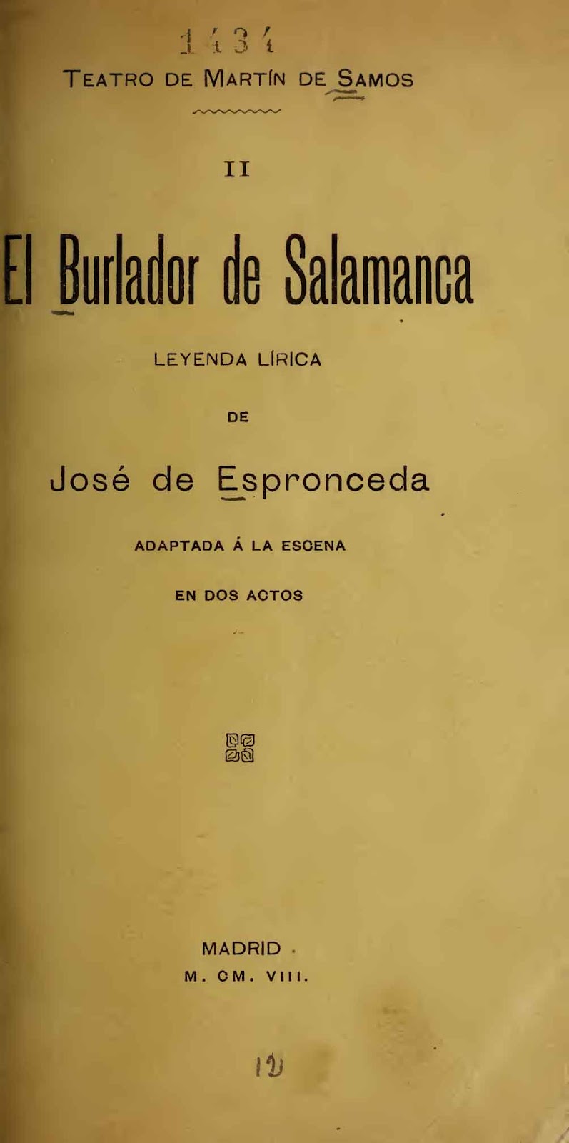 Celebrando el centenario del nacimiento de Espronceda el Ateneo Madrileño, aparte de sus conferencias, prepara una representación de “El Estudiante de Salamanca” en el teatro de la Princesa a primeros de 1908, con un arreglo efectuado por Mariano Miguel del Val, titulado “El burlador de Salamanca”. Leer Portada del Burlador de Salamanca bajo el seudónimo de Martín de Samos utilizado por Mariano Miguel de Val en el tándem literario formado junto a su íntimo amigo Adolfo Bonilla |