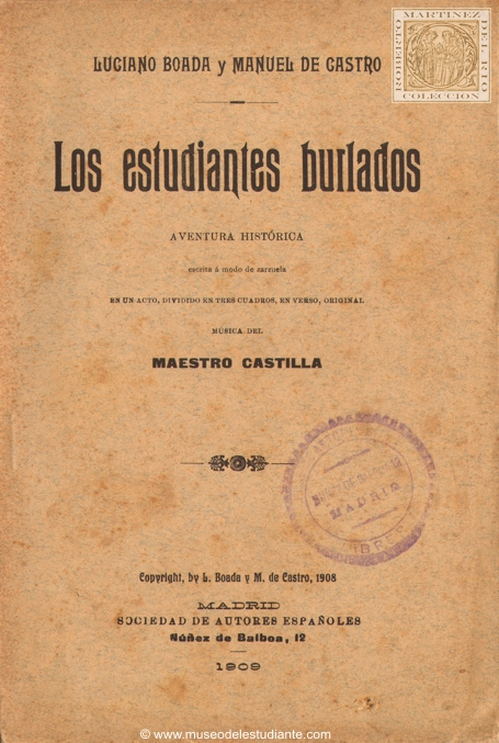 Aventura histórica a modo de zarzuela en 1 acto, dividido en 3 cuadros y en verso, música del maestro Ignacio F. Castilla y Herrera, libreto de Luciano Boada Gómez y Manuel de Castro y Tiedra, estrenada en el teatro Salón Regio de Madrid en 1895. La acción transcurre en Salamanca durante el reinado de Felipe III. Manuel de Castro, granadino, abogado y redactor de “El Globo”. Luciano Boada “heredador”, pues atendió, sucesivamente y heredó a sus tías Pepa, Catalina y Salomé, con lo que pudo dedicarse a la farándula. |