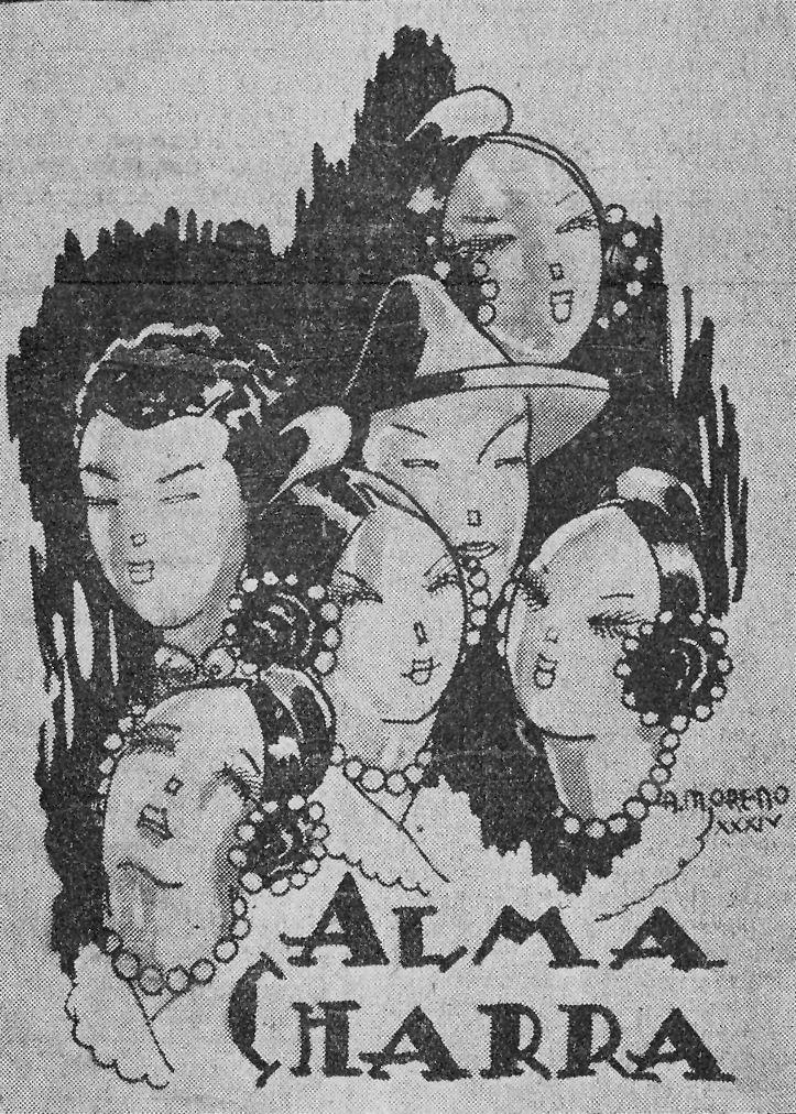 Se confunde esta zarzuela folklórica con la obra del mismo título, que es una “Suite, de aires del campo de Salamanca” del maestro Felipe Espino. Se trata de una obra netamente salmantina de José María Tavera y Delfín Val y adaptación musical del maestro León Terrero, interpretada por el “Cuadro Artístico Salmantino” el viernes 9 de febrero de 1934, en el teatro Coliseum. Se había estrenado en Madrid, en el María Guerrero, el 28/05/1933, auspiciada por la Casa Charra y le hizo la crítica el músico salmantino Manuel Parada. Pasó luego por Peñaranda y Vitigudino, siendo los coros parte esencial de la obra, interpretando hasta 35 motivos del Cancionero Salmantino: “Apañando aceitunas”, “El Burro de Villarino”, “Pastor”, “Era de nogal”, “La Tabernera”, “Canción de cuna”, “Fandango”… y el pasodoble “Alma Charra” compuesto por Terrero. El cartel anunciador fue obra del pintor Antonio Moreno, hermano de los célebres ventrílocuos Felipe y “Señor Wences”. Cartel anunciador de Alma Charra de Antonio Moreno |