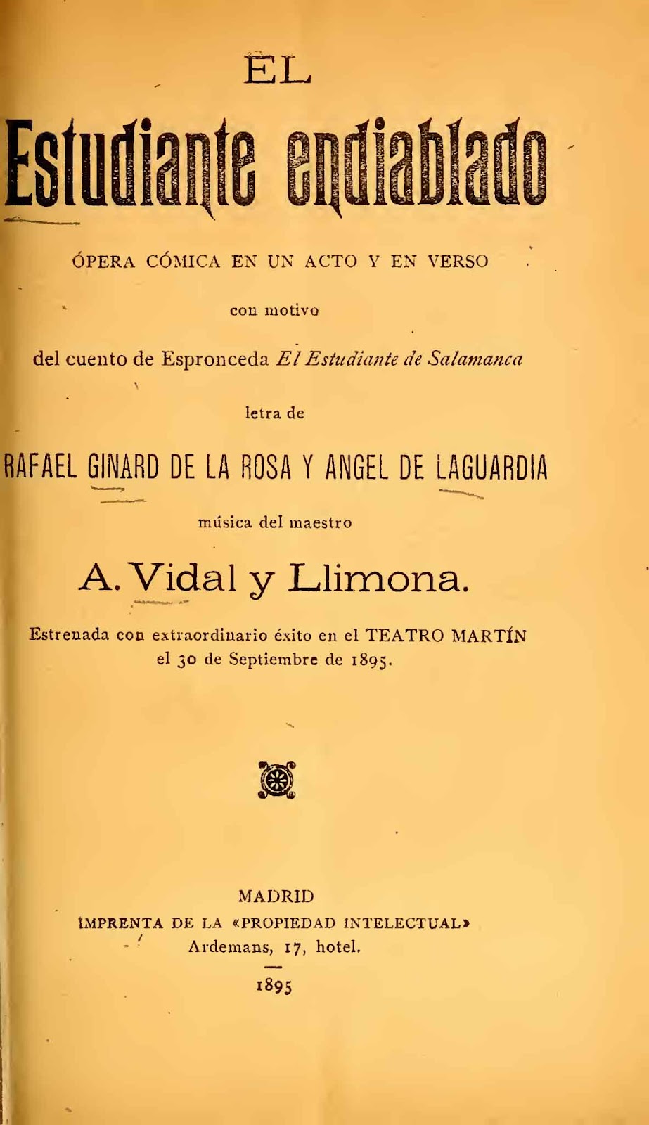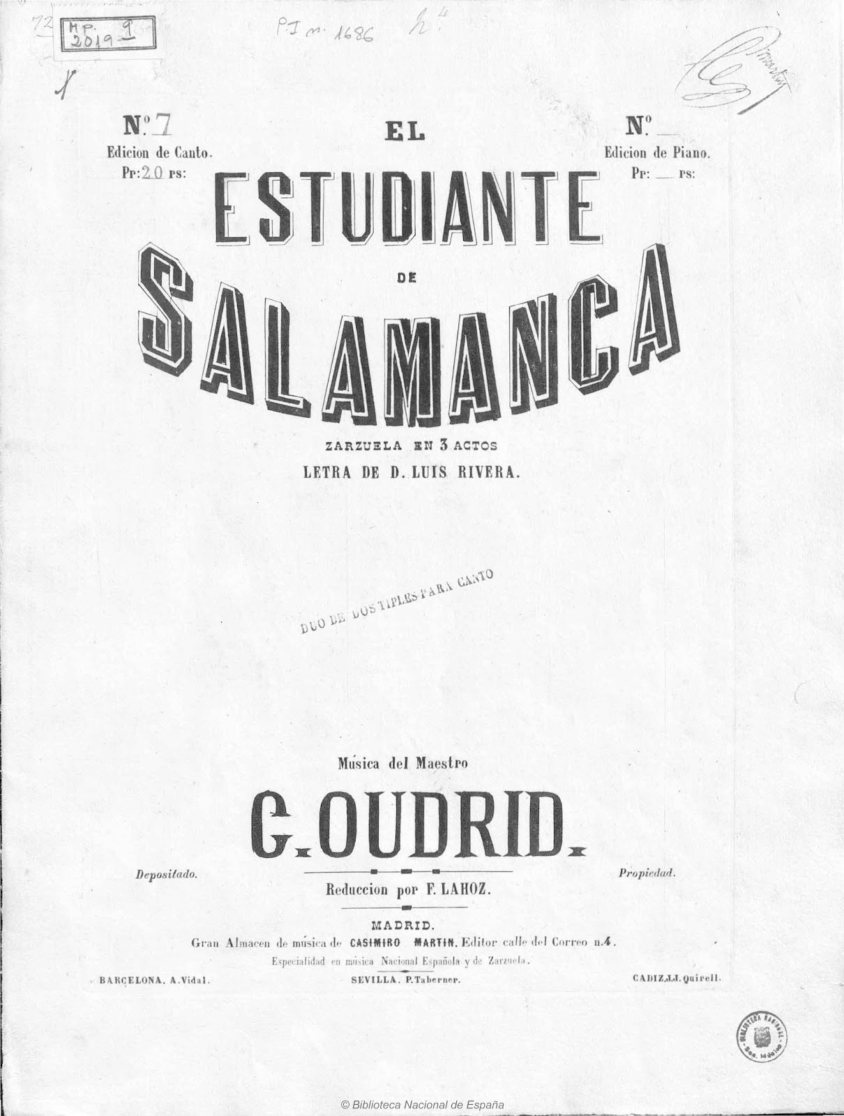 Zarzuela en 3 actos y en verso original de Luis Rivera Rodríguez, puesta en música por el maestro Cristóbal Oudrid y Segura, estrenada con notable acierto en el teatro de la Zarzuela, en la noche del 04/12/1867. No está basada en el texto del poeta sino que se trata de una creación donde la acción transcurre en Salamanca, siendo sus principales intérpretes: las señoritas Zamacois y Rivas y los señores Sanz, Calatañazor, Escriu y Calvet. Leer (libreto), Leer (música) Portada de la zarzuela El estudiante de Salamanca de Luis Rivera y Cristóbal en la Biblioteca Nacional |