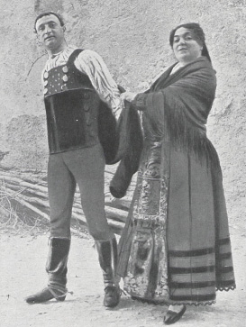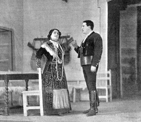 Drama en 3 actos, original de Luis Maldonado, estrenado en el teatro de la Princesa el 9 de setiembre de 1908. Sobre costumbres charras la acción transcurre en una alquería del campo de Salamanca. Fue representada por la compañía Cobeña-Morano, teniendo que saludar el autor 7 u 8 veces desde el palco escénico. Carmen Cobeña lució un riquísimo traje charro de finales del siglo XVIII. Mereció la consabida “Quisicosa” de El Adelanto: Te deseo Maldonado que tu “Montaraza”, esa / al triunfar en la Princesa / entre en el “coto cerrado” / del Arte cual en su “dehesa”. / Que dure una eternidad / y que por su calidad, / nuestros charros en la corte / dignos sean de su porte, / y que “haiga” felicidad. | Carmen Cobeña y Francisco Morano en una escena de "La Montaraza de Olmeda" en el teatro de la Princesa. Nuevo Mundo 16 de abril de 1908 |