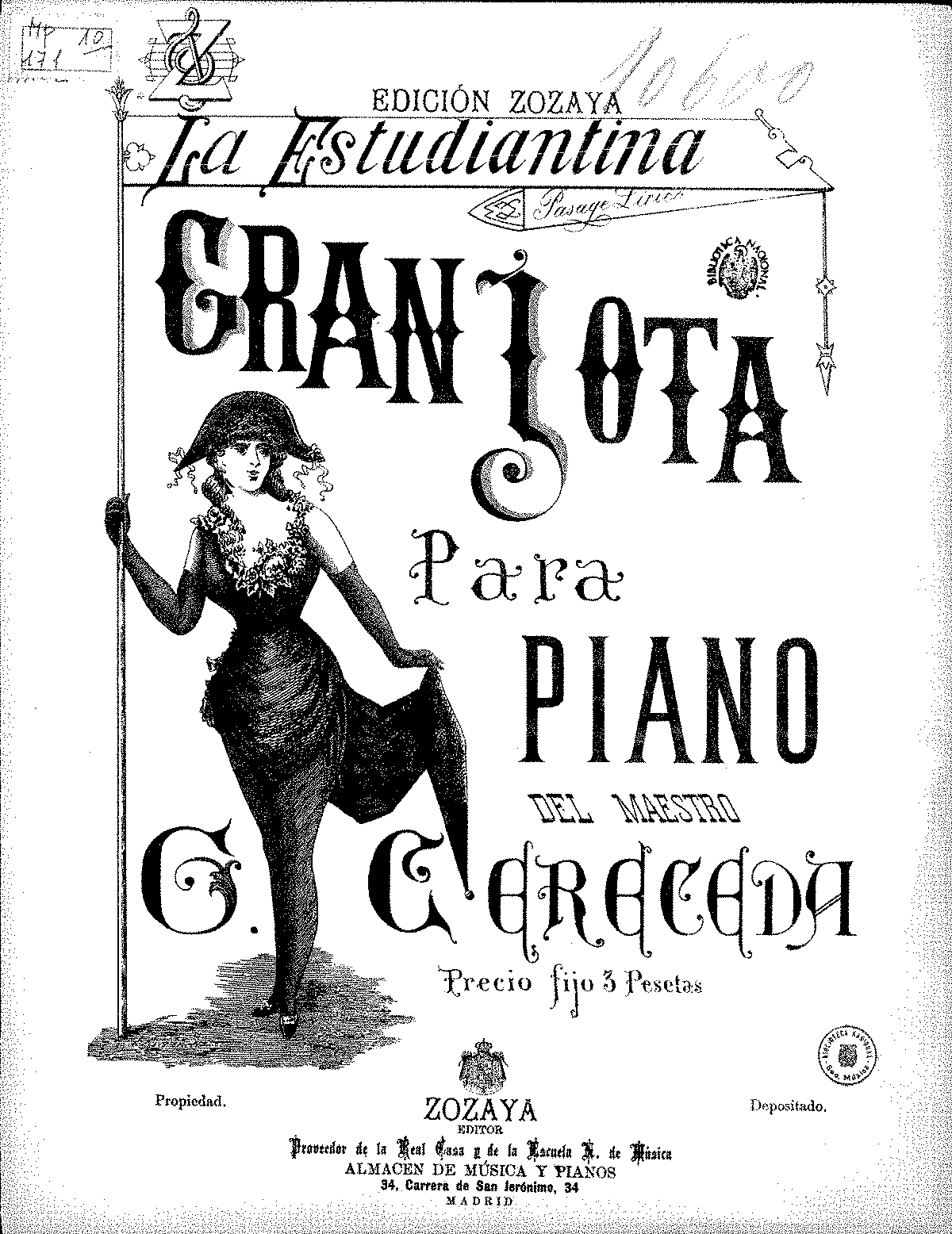Es un pasaje lírico en 1 acto, original de Guillermo Cereceda Somagosa, toledano, empresario y famoso por su mal carácter, estrenado en el teatro Apolo de Madrid el 31/03/1888 y donde destaca “La gran jota” para piano. Cubierta de la música de la Gran Jota de La Estudiantina de G. Cereceda |