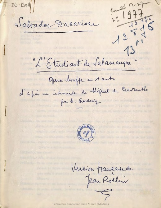 Opera bufa en 1 acto, libreto de Ezequiel Enderiz, reducción para canto y piano op. 38a de Salvador Bacarisse Chinoria, estrenada en 1944. Adaptación de la obra de Cervantes La Cueva de Salamanca que dirigió personalmente Bacarisse en Radio Montecarlo. Leer Portada manuscrita y correcciones por Salvador Bacarisse de la opera L'Estudiant de Salamanque. Fundación Juan March, Madrid |