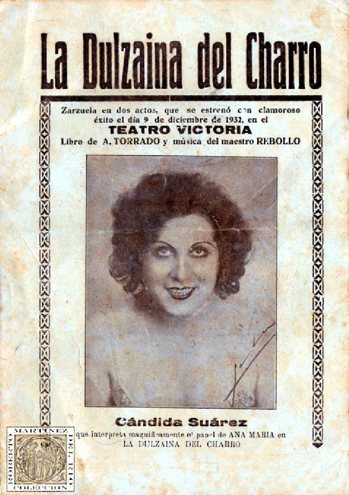 La escena se desarrolla en tierras salmantinas y es un fiel reflejo del sentir charro, a través de sus amores, sus fiestas, sus leyendas y sus cantos y danzas. Incorpora 3 cantos de boda: “Presente de boda”, “La ofrenda del ramo” y “La Rosca”. Son sus personajes: María Antonia, Carmina González; Catalina, Angeles Pulido; Tía Rosalía, Chelo García; Moza 1ª, Conchita Aires; Moza 2ª, Conchita de la Osa; Moza 3ª, Tere Gloria; Felipe, José Manuel Marcos; Prudencio, Antonio León Robuster; Tío Joaquín, Martín S. Polo; Tío Gregorio, José María Guervós; Quico el Alguacil, Castor Martín; Tío Romualdo, el tamborilero Medes; José el Cura, Poli Hernández; Polingue, Alejandro López; Pepito el vendedor, Laureano Riso; el Rojo otro vendedor, Andrés Sánchez; Mariano, Ramiro Herrero; Pedro, Miguel Díaz y el Alcalde. Se repitió la función el 29 de noviembre y luego en Villamayor, Barbadillo, Rollán y Cantalpino. Se interpreta de nuevo en el teatro Gran Vía el 22 de setiembre de 1949 por la Compañía de Ases Líricos con el empresario Santiago Rey a la cabeza. Los papeles estelares son para la tiple Purita Jiménez como María Antonia, el tenor Fernando Heras, como el mozo enamorado y el barítono Andrés García Martín. Tomaron parte los famosos dulzaineros de los Villares, tamborileros y Coros de Educación y Descanso. Ver zarzuela |