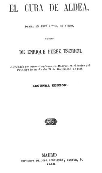 Drama en 3 actos y en verso original de Enrique Pérez Escrich, ambientada en Carrascal del Obispo en 1837. Luciendo trajes charros durante la Guerra carlista, se estrenó en el teatro del Príncipe el 24/12/1858. Pérez Escrich nació en Valencia y dado el éxito de su drama lo publicó como novela por entregas al estilo de Manuel Fernández y González. Murió en la indigencia en 1897. Se filmaron dos películas con el mismo título: en 1927 bajo la dirección de Florián Rey y 1936 por Francisco Camacho. Leer Drama, Leer novela vol. 1, Leer novela vol. 2 Portada de la segunda edición de El Cura de Aldea |