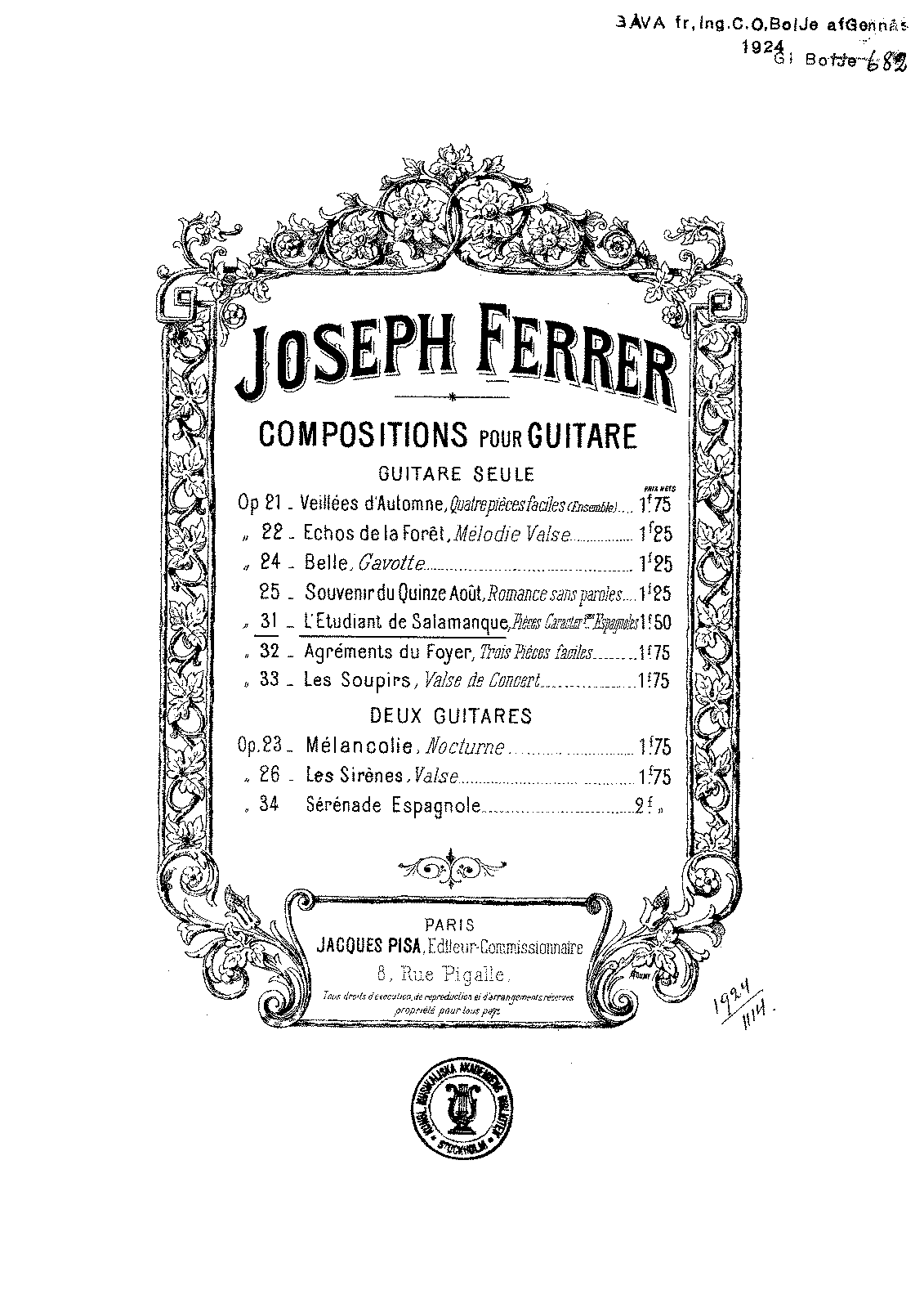 Tango vals op. 31, solo para guitarra de José Ferrer Esteve de Fujadas, de 1898. Oír, Leer partitura Obras de José Ferrer Esteve que incluye El estudiante de Salamanca |