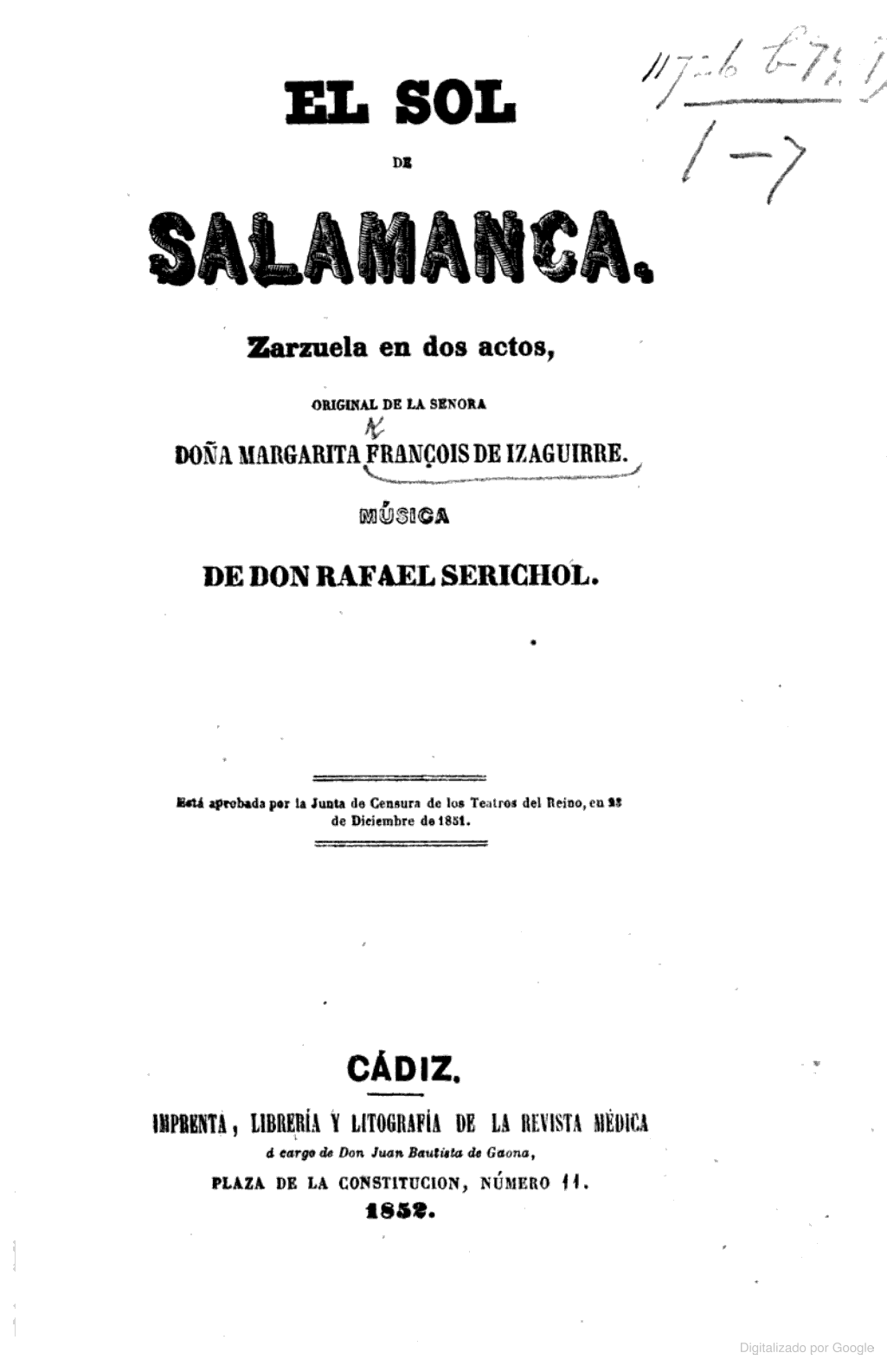 Zarzuela en 2 actos, original de la señora doña Margarita François de Izaguirre, música de Rafael Serichol. Publicada en 1852 y estrenada ese mismo año en el teatro Principal de Cádiz. La escena sucede en Salamanca en 16.., en la plaza de la Universidad y luego en la calle de Francos (hoy Rúa) hacia la iglesia de san Martín. Al final del acto primero un coro de estudiantes, desde dentro, cantan: Resuene por todo el mundo / repitamos con placer / Viva el Sol de Salamanca. / Viva la hermosa Isabel. Libreto Portada del libreto de la zarzuela El Sol de Salamanca |