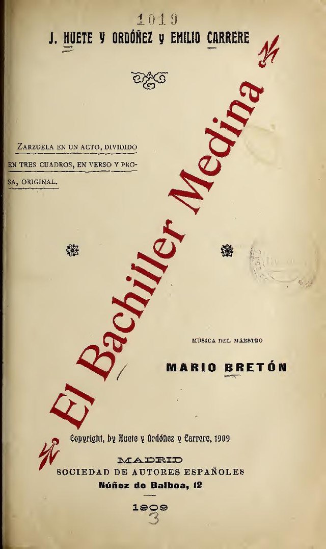 Zarzuela en 1 acto, dividido en 3 cuadros, en verso y prosa, original de Emilio Carrere y Justo Huete y Ordoñez, música de Mario Bretón, de ambiente estudiantil junto a matones y jugadores, estrenada en el teatro del Noviciado de Madrid, el 13/04/1909. La acción transcurre en Salamanca a comienzos del siglo XVIII en el mesón del Lagarto. Leer Portada del libreto de El bachiller Medina |