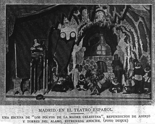 Adaptación de la obra de Hartzenbusch por Antonio Asenjo y Ángel Torres del Álamo, en 3 actos, estrenada en el teatro Español el 21/12/1922, con escenografía de Fernando Magnani. Imagen de la obra Los polvos de la madre Celestina, Teatro Español, Madrid, 1922, remozada por Ángel Torres del Alamo y Antonio Asenjo, que aparece en la Crítica teatral en ABC, el 21 de diciembre de 1922 |