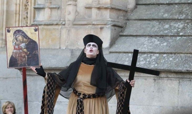 Con motivo del V centenario del inicio de la construcción de la Catedral Nueva, la compañía salmantina Eton Teatro, creada en 1980, estrena la obra en la Plaza de Anaya con el patrocinio del Ayuntamiento. Siendo sus intérpretes principales: Marta Benito, Ángel González, Gloria Escudero y Alberto Boyero. El personaje protagonista es el salmantino Lucas Fernández que vivió bastante eclipsado por la obra del paisano Juan del Enzina. Escena de Salmántica el año trece una catedral merece.. Fotografía de Salamanca24horas |