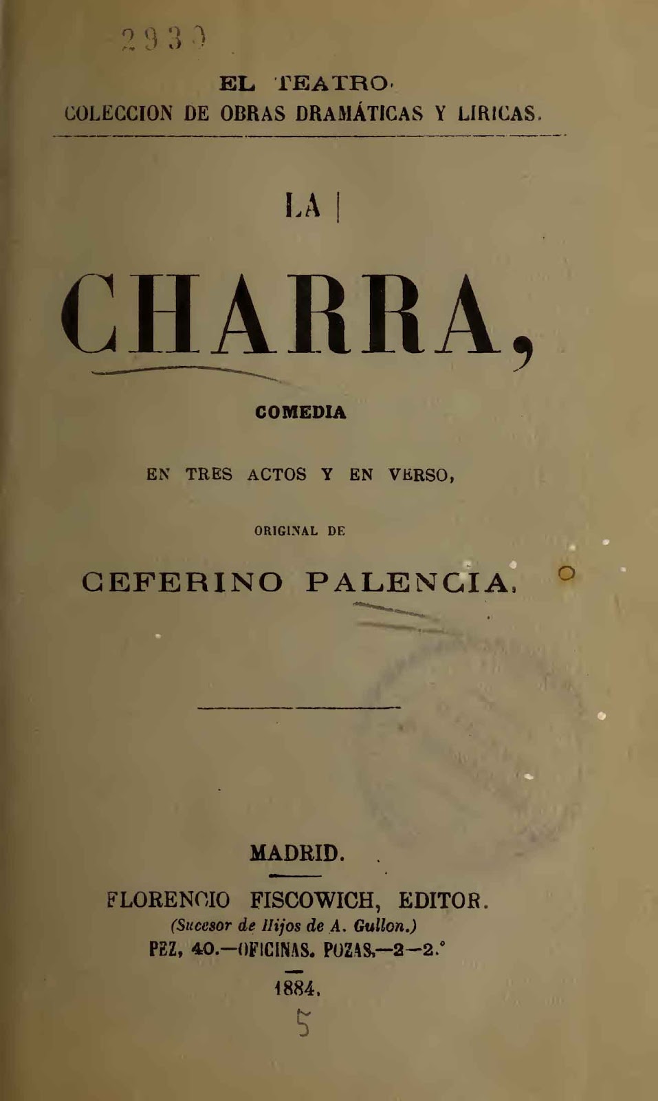 Comedia en 3 actos y en verso, original de Ceferino Palencia y Álvarez, estrenada en el teatro de la Comedia de Madrid, el 25/01/1884, dirigida por Emilio Mario. “La Charra”, estrenada a mayor lucimiento de María Tubau, es una comedia moralista encaminada a la demostración de los daños que producen las costumbres extranjeras y que rebosa alardes de patrioterismo. La protagonista y su familia representan la España lígrima, ejemplar en su llaneza, que choca contra el nuevo mundo del progreso europeizante. Triunfó en España entre el pueblo llano y en Méjico lo hizo clamorosamente, mereciendo las alabanzas de Amado Nervo, cuando firmaba con el seudónimo de “Benedictus”, pero la crítica no fue tan benévola con ella. |