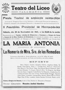 El día 14 de junio de 1947, a las 7:45, se estrena en el teatro del Liceo la zarzuela folklórica de ambiente charro “La María Antonia o la Romería de Nuestra Señora de los Remedios”, con letra del tamborilero Nicomedes de Castro Alonso, “Medes” de Villamayor y Rafael Cordón y música del salmantino Aníbal Sánchez Fraile, profesor del Conservatorio Nacional, que actuó como director concertador. La gala fue patrocinada por el Excmo. Ayuntamiento, con la colaboración de las agrupaciones artísticas de la obra de Educación y Descanso. Los decorados fueron hechos por la Viuda de López Muñoz de Madrid y alguno por el pintor salmantino Germán Herrero. |