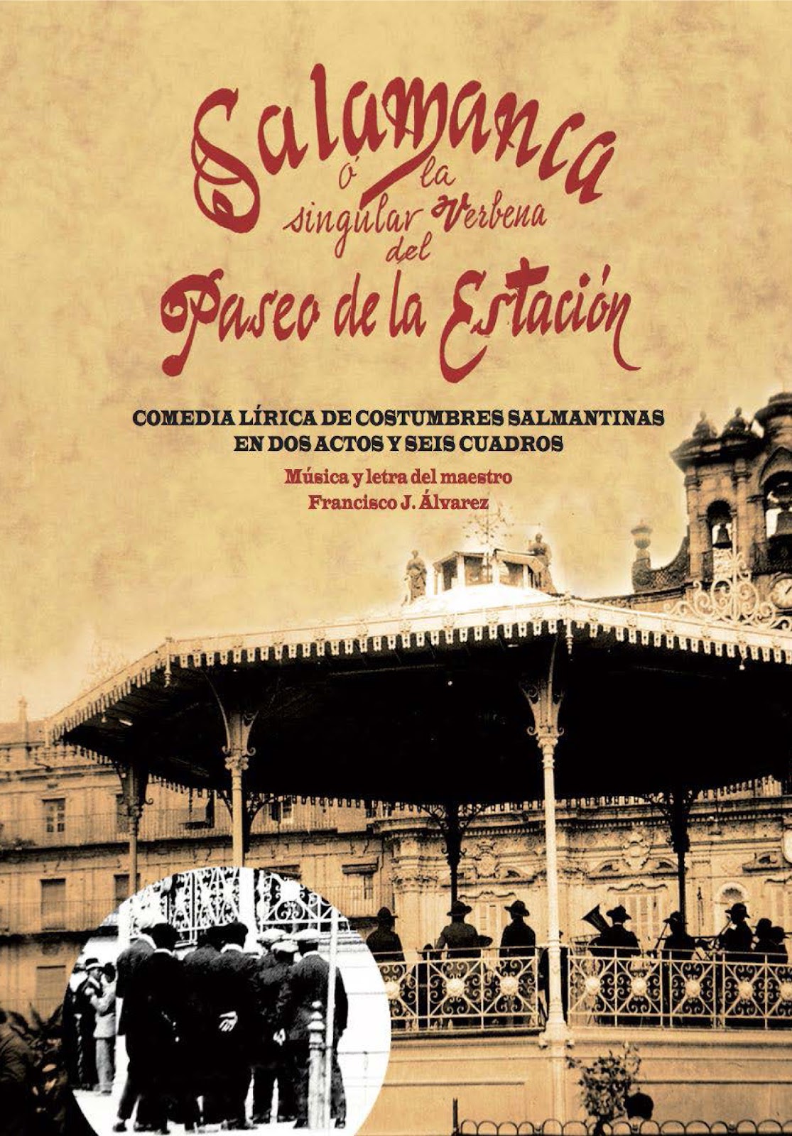 Con el apoyo de la “Fundación Salamanca Ciudad de Saberes” y producida por la “Fundación Municipal de Cultura”, se estrena la comedia lírica de ambiente salmantino en 2 actos y 6 cuadros, representada los días 9, 10 y 12 de junio de 2017 y luego en Ferias de setiembre otros 4 días en el teatro del Liceo. Letra y música son originales de Francisco José Álvarez García, arreglos musicales de la Banda por el clarinete Jerónimo Jiménez Pérez y constituye la primera zarzuela de costumbres en el siglo XXI. Intervienen el “Coro Ciudad de Salamanca”, el “Grupo de Montaraces y Charros” y la Banda Municipal, dirigida por Mario Bercher Grau, coordinador del proyecto. El argumento no puede ser más sencillo pues va del traslado del templete metálico de la música que estuvo en la Alamedilla desde 1898 y vuelve a la Plaza Mayor por Ferias de 1906, aunque luego, nuevamente, el 26/09/1930 regrese a la Alamedilla. Se trata de que Alfredo Fuentes, dueño de un local de bebidas del Paseo de la Estación se presenta al concurso de verbenas organizado por el Ayuntamiento con el exclusivo propósito de enamorar a Clara Martín, humilde artesana y experta bailarina. | Cartel de la zarzuela Salamanca o la singular verbena del Paseo de la Estación |