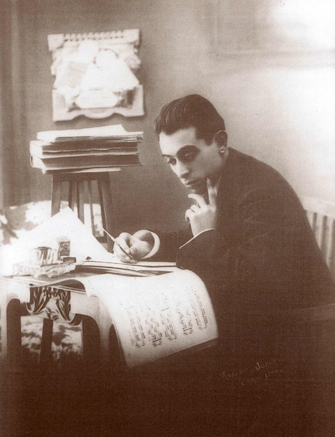 Se iba a estrenar en el teatro Liceo el 27 de octubre 1916 a las 6:30 de la tarde pero hubo de aplazarse al día siguiente porque el maestro no había podido terminar la instrumentación. Se trata de un apropósito cómico-lírico, compuesto de un prólogo, 3 cuadros y una apoteosis, original del alumno de la Facultad de Filosofía y Letras Virgilio Ruiz, con música de los maestros Bernalt, Amat y Velasco. Recoge escenas de la vida cotidiana de la ciudad con abundantes chistes y un fácil e ingenioso diálogo. Desfilan personajes como Félix, que es el propio avisador del teatro, las menegildas llenando sus cántaros en el caño de la plazuela del Liceo, los estudiantes en la encuadernación de Eusebio Lizcano, guardias en compaña, el inefable mendigo Jesús González Calvo “Maelo”, el coro de chulos y manolas y los bailarines charros como final en la apoteosis. Bernardo García Bernalt trabajando en una partitura. Fotografía de Ansede y Juanes |