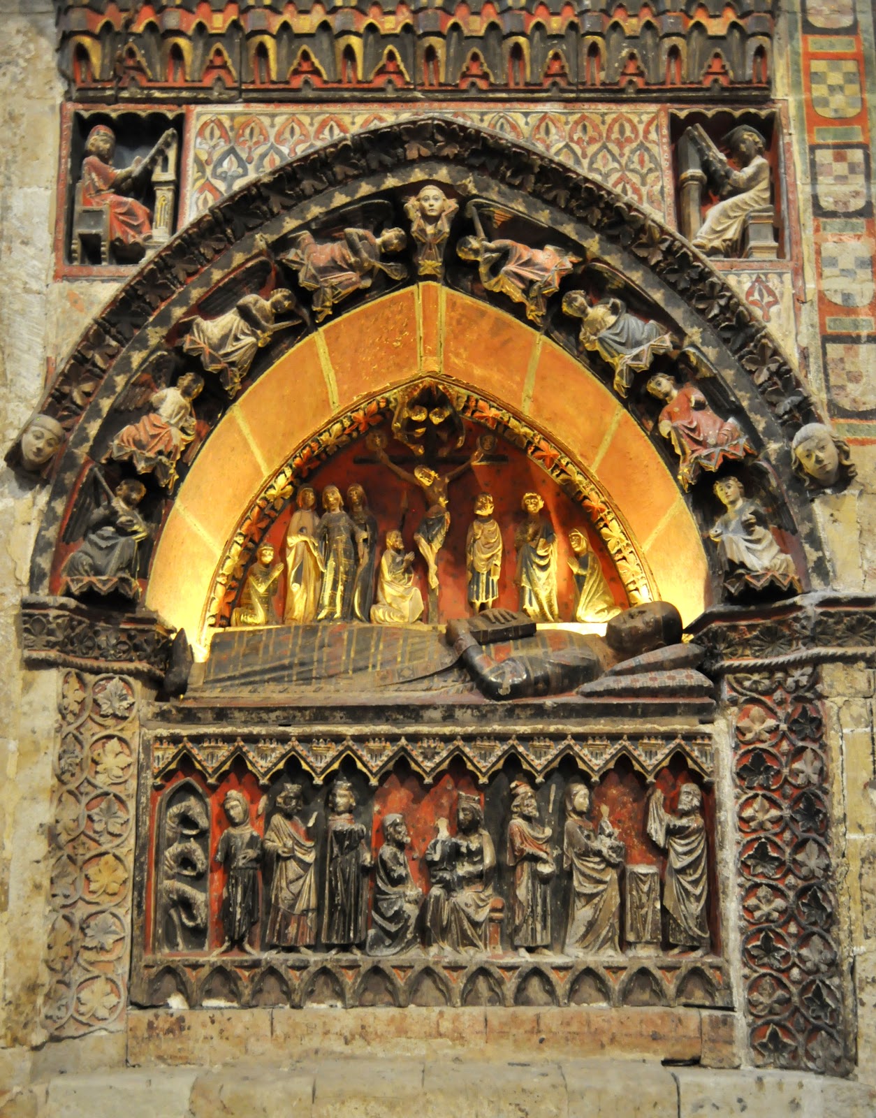 En el tímpano del arco sobre tonalidad rojiza, destaca un precioso bajorrelieve, de esmerada ejecución, con un programa iconográfico de las exequias de ambiente castellano que preside un Crucifijo rodeado de ocho elegantes y esbeltas figuras.