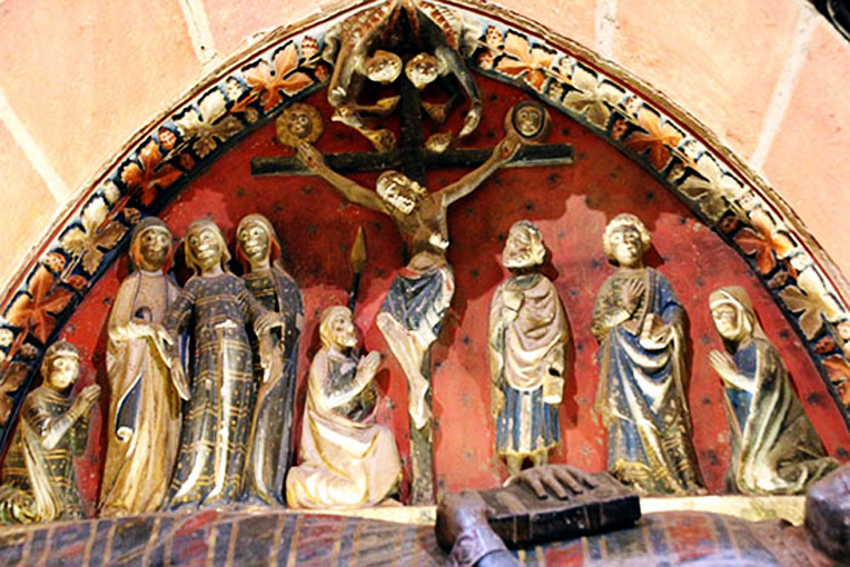 Destacan en el grupo las dos Marías, con la Virgen ayudada en su desmayo por ellas, todas en pie con ricas vestimentas y fino tocado; junto a Cristo el centurión Longinos arrodillado e identificable por la lanza; al lado contrario otra persona: Stefaton, de pie con túnica corta y manto blanco, ofreciendo el hisopo impregnado en hiel y vinagre y San Juan, también en pie, imberbe y de rizada melena de tono oscuro y con rica vestidura. Las figuras de los extremos se supone corresponden al arcediano y a su hermana doña Teresa, ambos en actitud orante de rodillas. Dos ángeles que emergen desde la clave del arco inciensan al Crucificado y sobre el enclavamiento de las manos un sol y una luna, significando la victoria de Cristo en la Cruz sobre todo el universo.