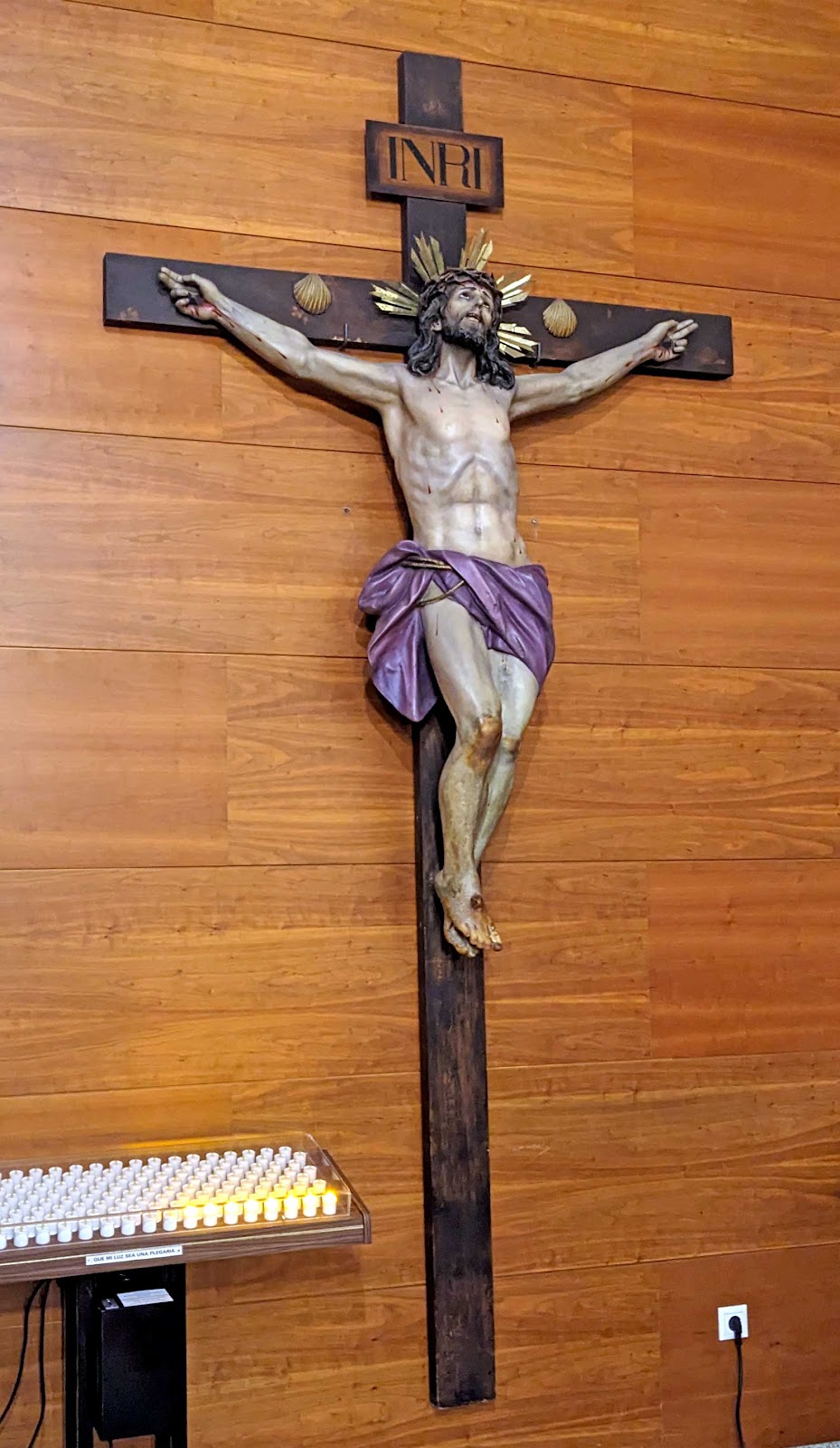La Cruz plana, oscura y grande lleva dos conchas colocadas sobre el travesaño entre las manos del Cristo. La cartela es un simple panel grande con ligero y oscuro sombreado en los bordes.