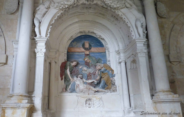 Sobre el sepulcro, en lugar de la figura yacente del protagonista, como se acostumbraba en la época, se exhibe sobre el tímpano, como se ha dicho antes, un relieve policromado en el siglo XVIII, de la Piedad o Quinta Angustia, en la que se hace efectiva la profecía de Simeón "una espada atravesará tu alma" (Luc 2, 35) con las figuras de Jesús bajado de la Cruz y sujetado por la Virgen, San Juan y las dos Marías.
