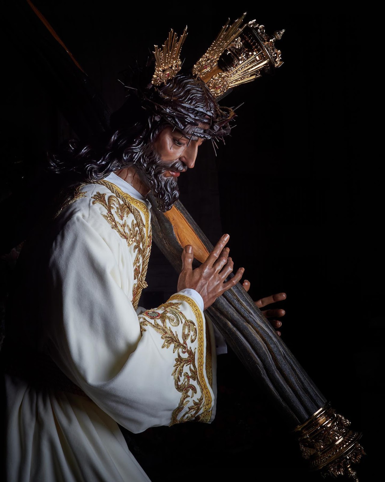 Habitualmente recibe culto esta imagen en la primera capilla del lado del evangelio, vestida con túnica morada, ornamentada con bordados en cordoncillo e hilos de oro, mientras que en el desfile procesional la túnica que luce es de raso blanco, bordada con adornos de oro y cíngulo de siete vueltas trenzado en el mismo metal, realizada por las Mm. Adoratrices de Madrid y regalada por doña María García López. (Desfila con tal color por inspiración de los padres Dominicos quienes argumentan que era blanca la túnica que llevaba Jesús en su camino hacia el Calvario)3. "Herodes, con sus soldados, despreció a Jesús y burlándose de Él, le puso un vestido blanco y lo envió a Pilato". (Luc 23,11)