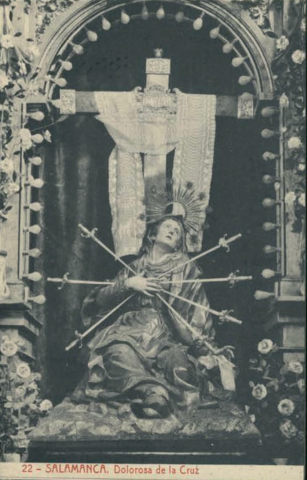 Fue esta imagen motivo de inspiración para don Miguel de Unamuno quien en el año 1916, dice: "En esta ciudad de Salamanca hay una de esas imágenes de nuestra castiza talla policromada en madera, obra del escultor Corral, que es una maravilla de expresión y de españolidad. Hace nueve días, el Viernes de Dolores, la vi otra vez, según pasaba aquí, bajo mi balcón, llevada en hombros de devotos, mirando al negro cielo de la noche con ojos lacrimosos. La expresión de dolor, eternizada en ella por el arte, era algo sereno, noble, reconfortante. Me pareció ver a mi patria"5.