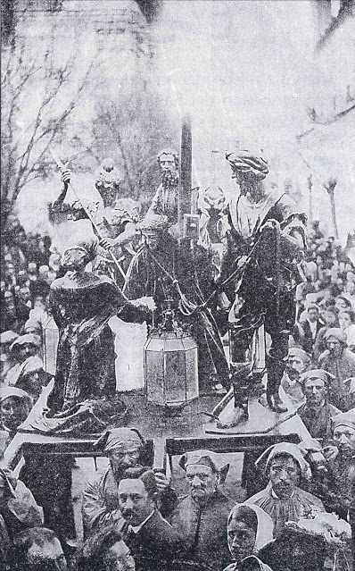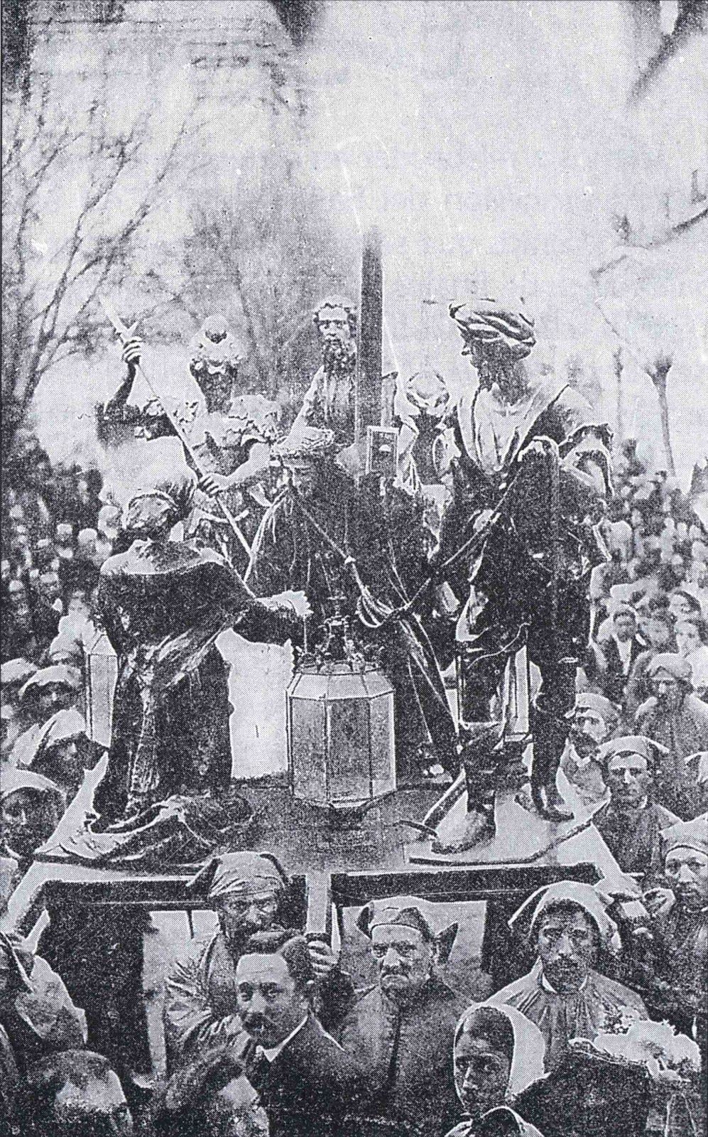 Desfila sobre carroza de madera con sencillo adorno en toda su circunferencia de cenefa dorada, pobre imitación de una corona de espinas.