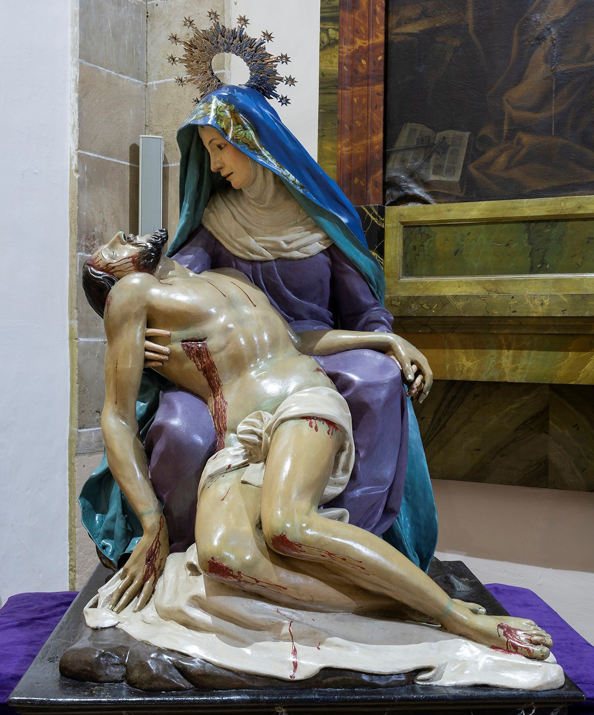 La Piedad o Quinta Angustia, de añeja tradición en la iconografía religiosa, nace en el gótico alemán antes de 1300 y siguiendo la ruta de Flandes llega a España un poco tarde.