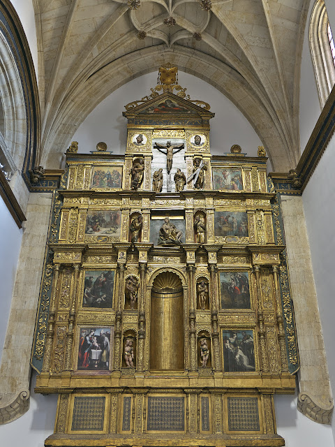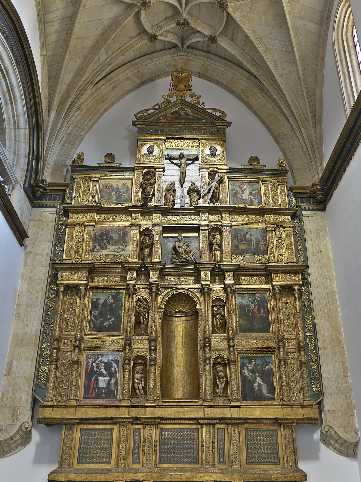 El retablo, que sufrió traslado en 1549 al ampliarse la capilla y tener que ser acomodado de nuevo, es un ejemplar típico del preciosista arte plateresco y consta de cuatro cuerpos, tres calles y cuatro entrecalles con amplia decoración de grutescos en los frisos y la misma ordenación que el de San Benito de Valladolid, obra del mismo autor.