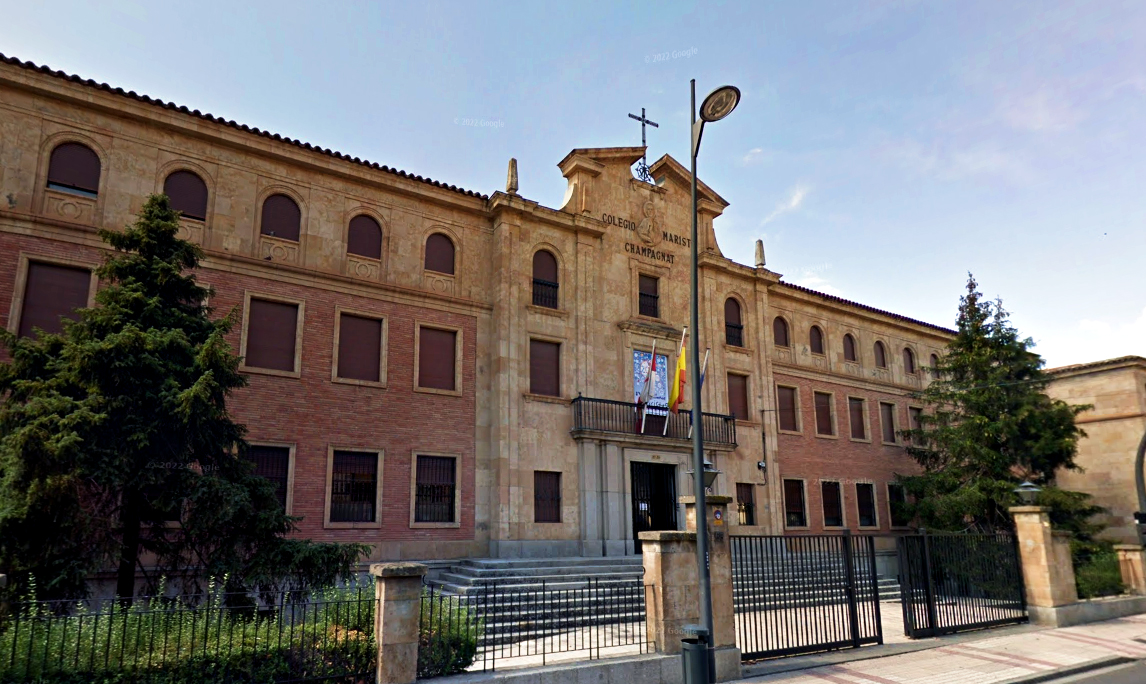 El 25 de julio de 1953 se firma la escritura privada de compra de dichos terrenos, comenzando a realizar los proyectos del nuevo colegio, siendo el 6 de junio de 1954, fiesta del Fundador de los HH. Maristas, cuando se coloca la primera piedra, en el eje de la fachada principal, del que se denominará “Colegio Marista Champagnat”, bendecida por el obispo de la diócesis Fray Francisco Barbado Viejo, con la asistencia de las Autoridades salmantinas y del Colegio en pleno, realizándose una misa al aire libre, cantada por todos los alumnos, siendo seguida por todos los asistentes con sumo recogimiento y emoción.